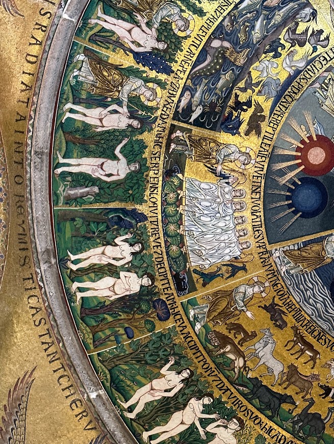 On the panel above (my photo from January 2023) you see the story of creation to the fall of man through the Ark. Look at the animals and the dynamicism of the color and expression.