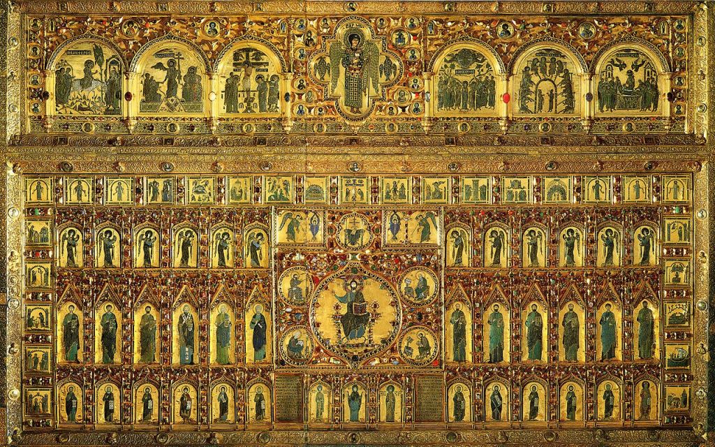 Literal translation is the Golden Pail or Golden Cloth. This high altar retable of St. Mark’s Basilica is one of the finest examples of Byzantine enamel style with both the front and rear sides decorated.