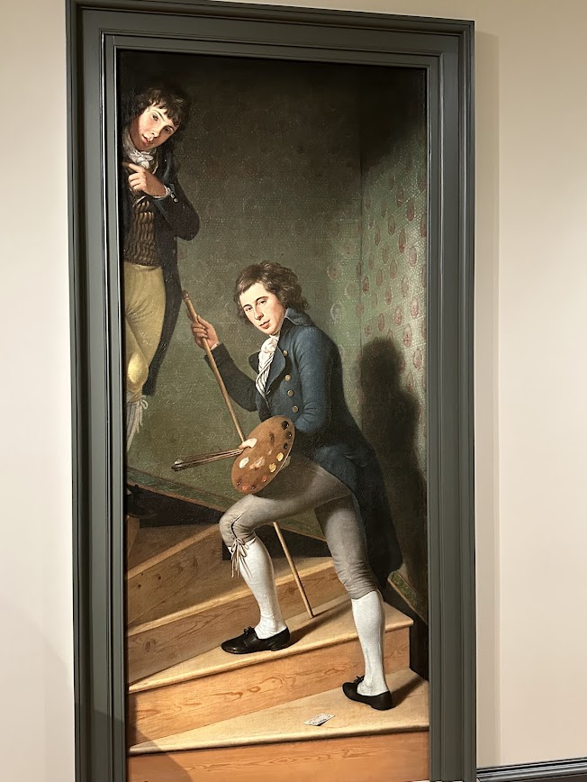 Titian Ramsay Peale, who crafted natural science displays, gestures at the top of the stairs as his older brother, Raphaelle, an artist with his palette in hand, strides upward just above a real step attached to the base of the canvas. The life-size portrait is known to have startled and delighted visitors, reputedly even George Washington, before the Peale Museum’s collection was dismantled and finally sold in 1854. Acquired by the Philadelphia Museum of Art in 1945, the picture continues to engage and welcome visitors. – PMA website
