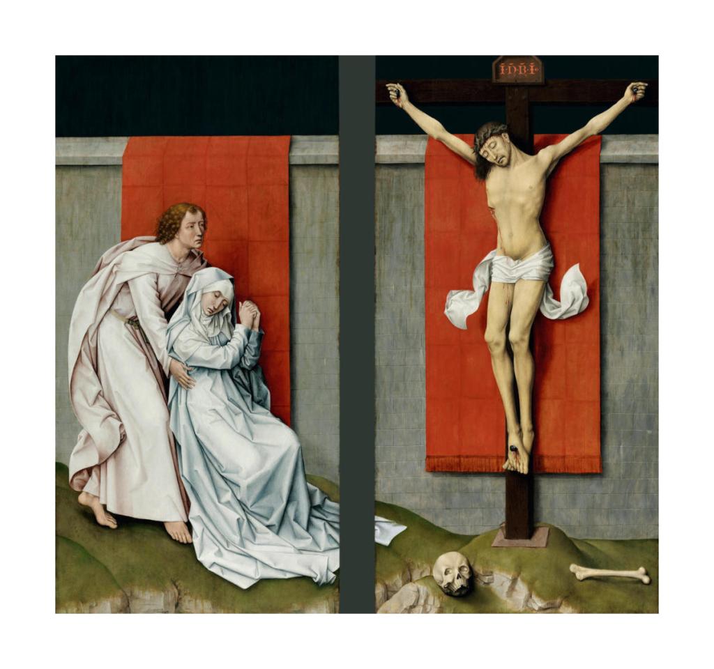 From the museum website: “To convey overwhelming depths of human emotion, Rogier located monumental forms in a shallow, austere, nocturnal space accented only by brilliant red hangings. He focused on the experience of the Virgin, her unbearable grief expressed by her swooning into the arms of John the Evangelist. The intensity of her anguish is echoed in the agitated, fluttering loincloth that moves around Christ’s motionless body as if the air itself were astir with sorrow. Rogier’s use of two panels in a diptych, rather than the more usual three found in a triptych, is rare in paintings of this period, and allowed the artist to balance the human despair at the darkest hour of the Christian faith against the promise of redemption.”