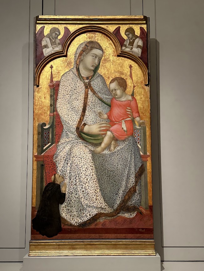 A contemporary of Duccio, Pietro Lorenzetti and his brother Ambrogio were renowned Sienese painters who introduced naturalism into Sienese painting. This work, The Virgin and Child Enthroned with a Servite Friar and Angels was completed in 1319. It once formed the center section of a large altarpiece. The small man kneeling in prayer wears the robe and tonsure haircut of a monk or friar. It is believed he is the donor who commissioned the altarpiece probably for the church of his own convent. (source PMA)